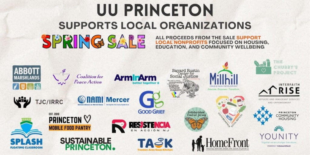 The organizations selected as 2026–2027 Outreach Grant recipients (to be funded by proceeds from the 2026 UU Princeton Spring Sale) are listed below along with the congregant sponsor. The Grant Committee includes Gareth Funka-Lea, Corky Reslier, Louise Senior, Lisa Trayner, and David Avasthi. Interested in supporting this work? Consider sponsoring an organization in fall 2026.